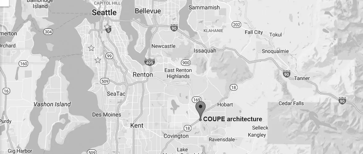 Black and white map showing Seattle and surrounding areas, with a marker labeled “COUPE architecture” near Covington, southeast of Renton and Kent—your Pacific Northwest residential architect contact.