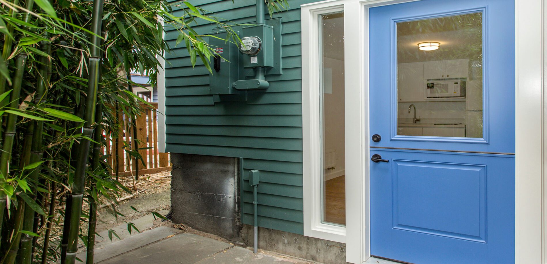 Blue door with glass window leads into a house with green siding; utility meter and bamboo plants are visible outside—an inviting example of Accessory Dwelling Units blending style and function.